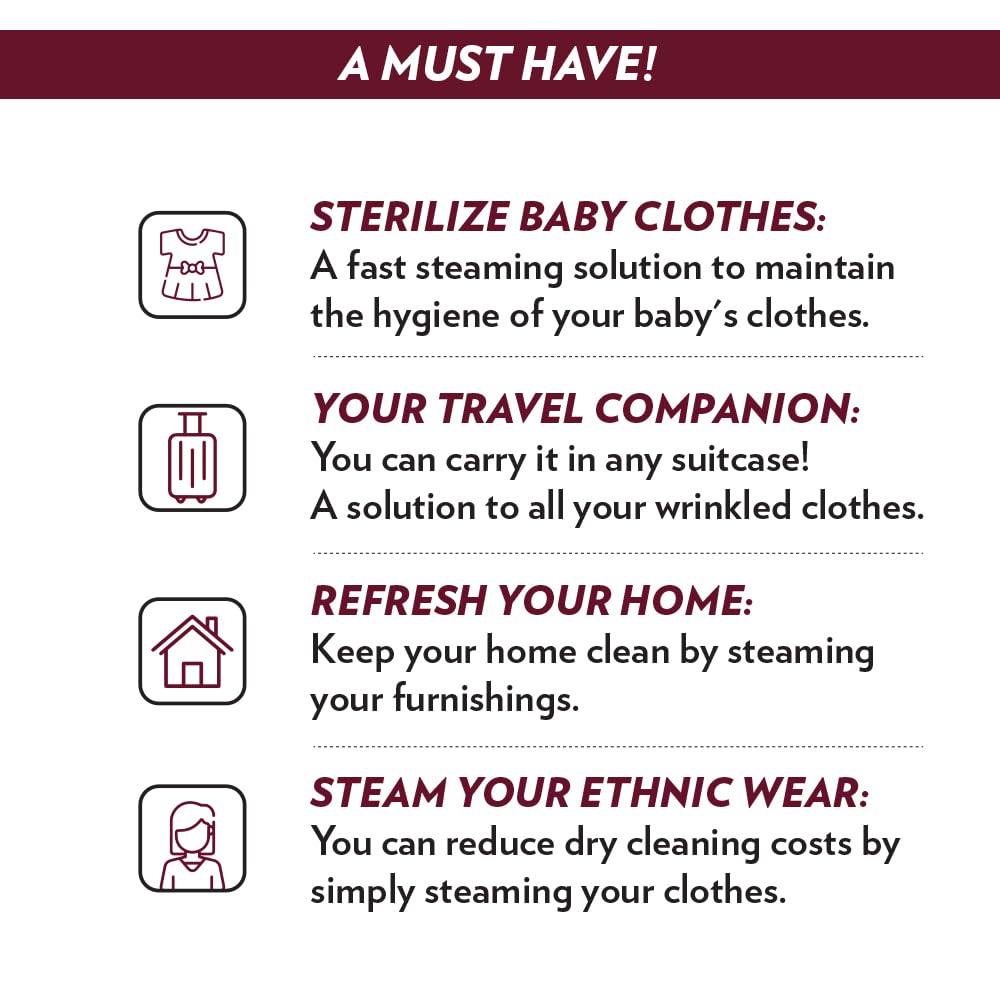 - Package Contents – 1N Steamer, 1N Detachable Cloth Brush, 1N Carry Pouch, 1N Water Cup & 1N User Manual.