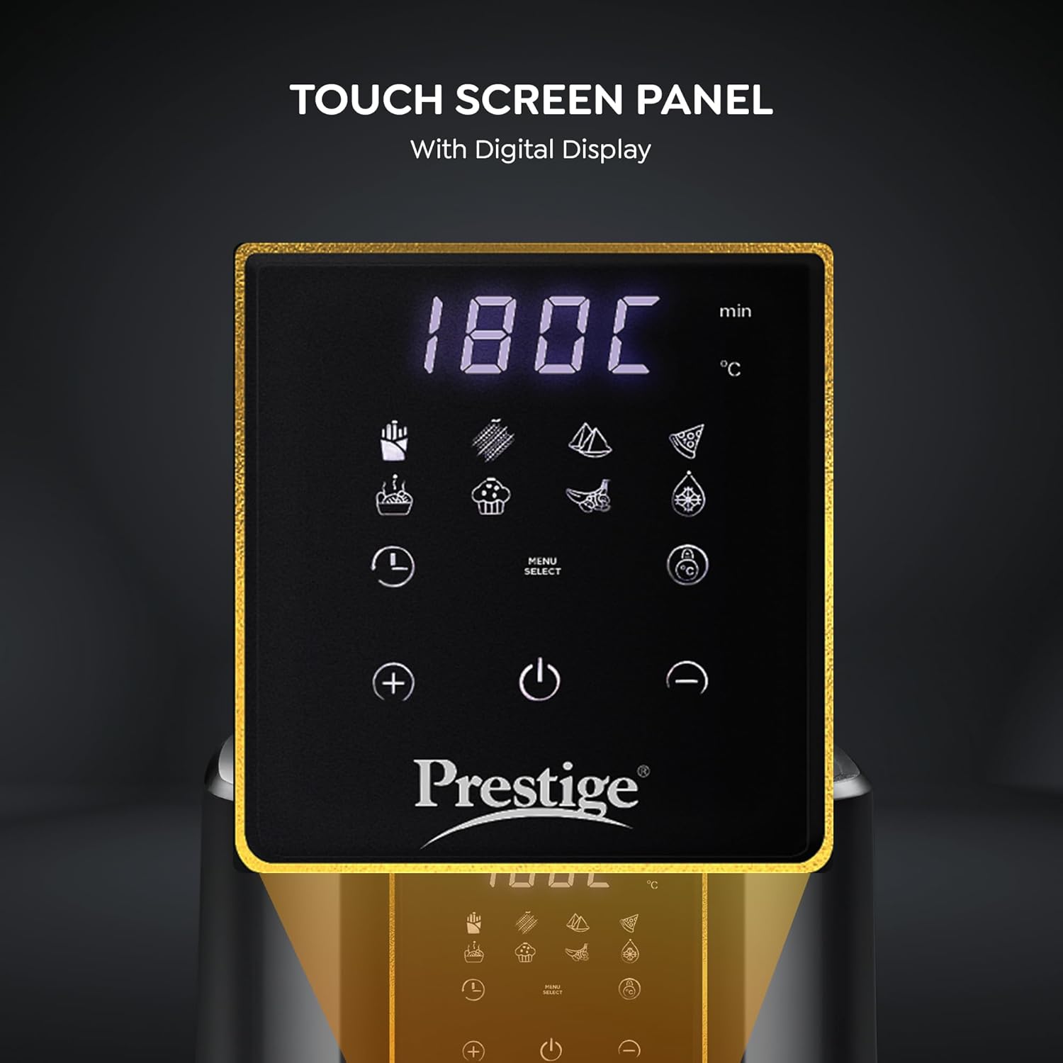 Prestige Nutrifry Electric Digital Air Fryer| 80% less Oil Consumption|4.5L Capacity |1200 Watts Power|Fry,Grill,Roast,Bake,Reheat|Digital Display with 8 Preset Menu|Easy to Clean Frying Basket|Black