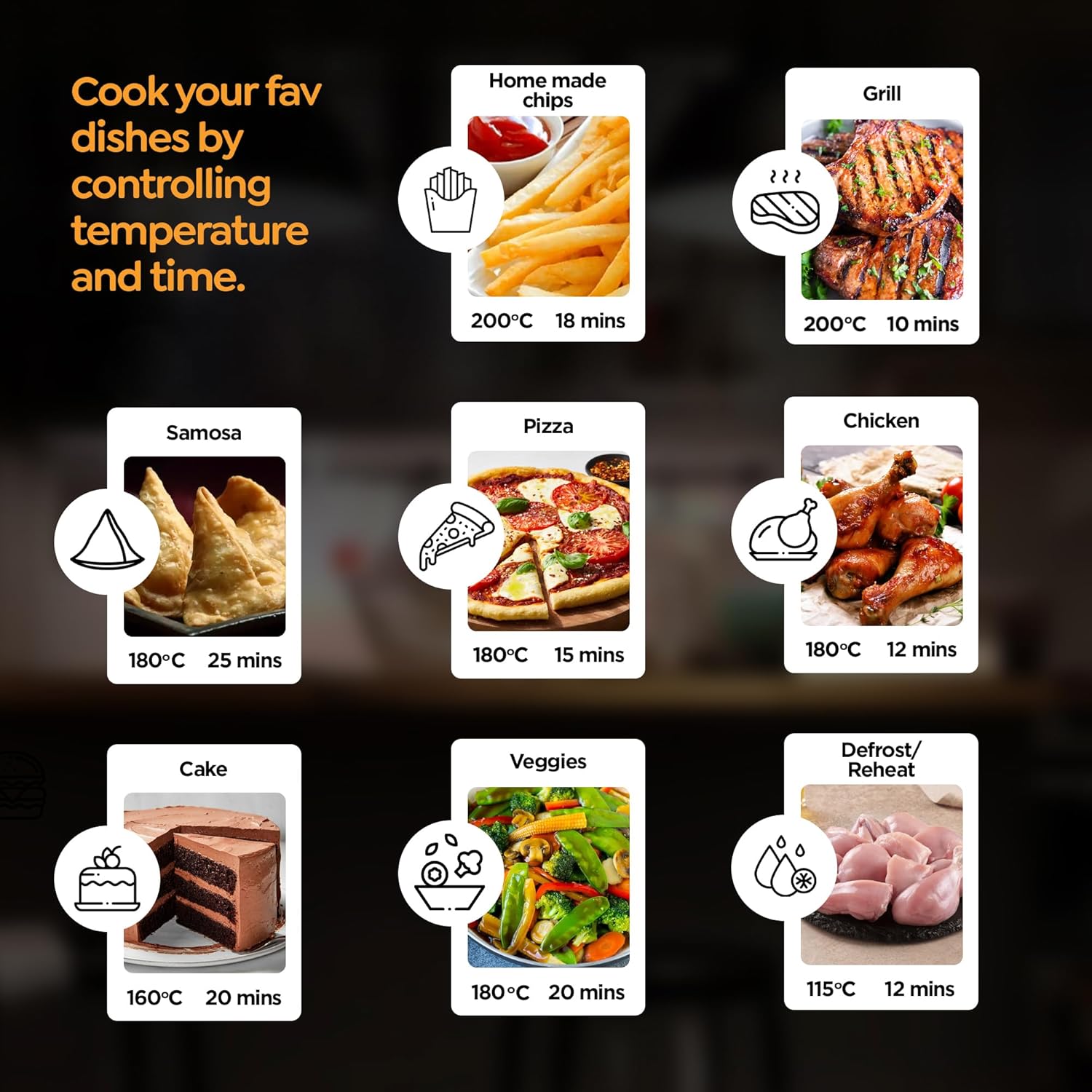 - Introducing 8-Preset Cooking Modes: Home made chips, Grill, Samosa, Pizza, Cake,Veggies, Defrost/Reheat, Chicken