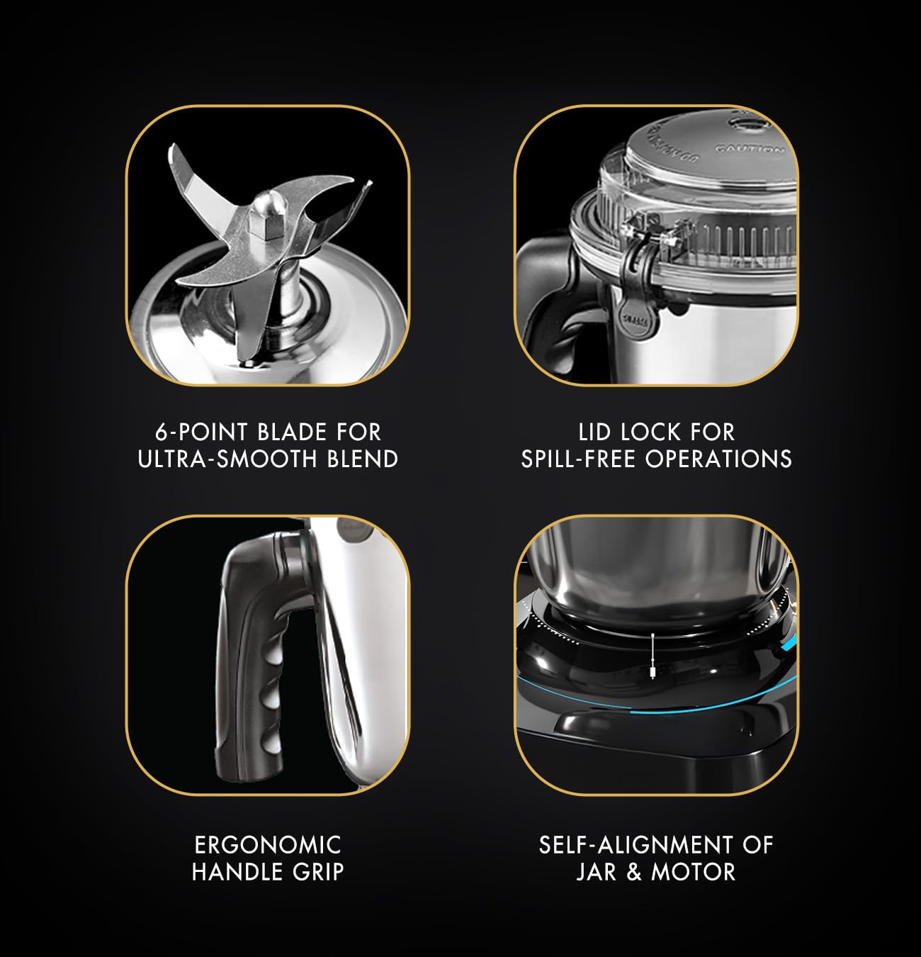 - Jar Set Included: 1.75 L Transparent Blender Jar (Unbreakable) Ideal for shakes, smoothies, purees, cold coffee, cocktails, mocktails, buttermilk, and more. 1 L Stainless Steel Dry Grinding Jar Multipurpose jar for grinding masalas, spices, cereals, pulses, coffee beans – suitable for both dry and wet grinding. 500 ml Stainless Steel Chutney Jar with Safety Lock Perfect for making chutneys, dips, pastes like ginger-garlic, coconut, mint, tamarind, etc.