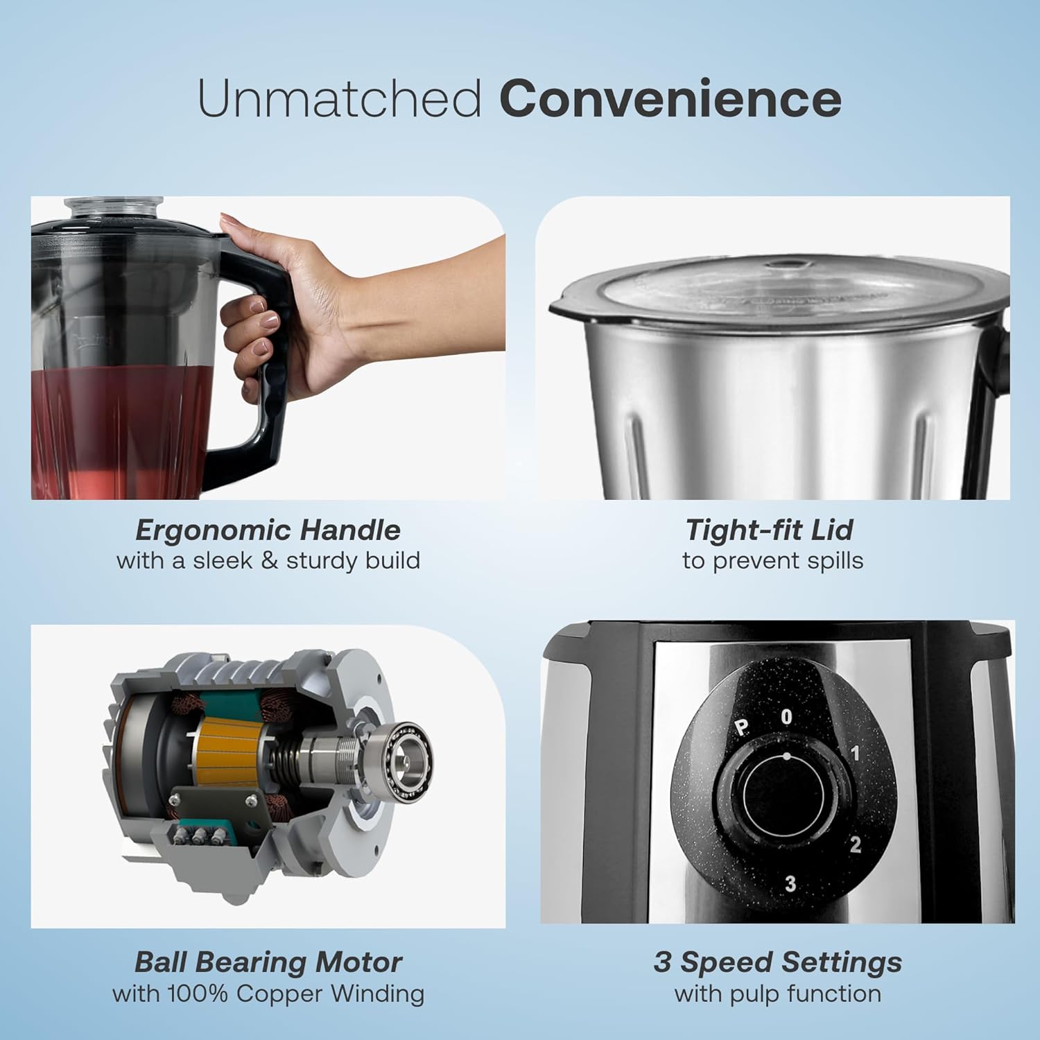 - STURDY HANDLES: Handling this mixer grinder is easier than ever. Thanks to the ergonomically designed sturdy handles.